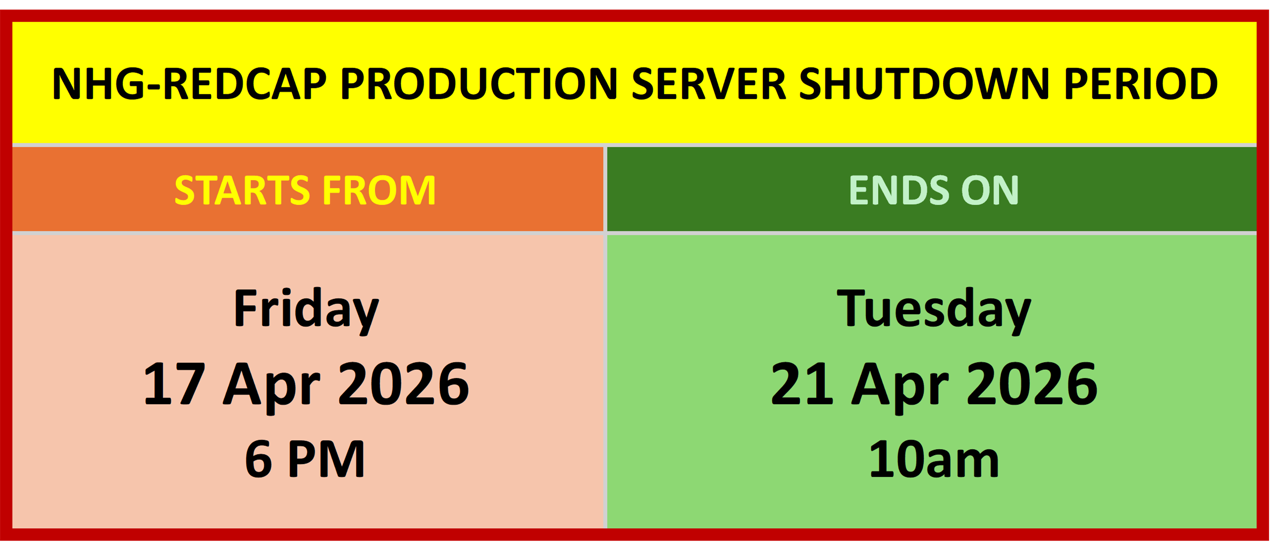 The NHG-REDCap Production Server will be shutting down between 17th to 21st Apr 2026 to facilitate server upgrading and maintenance works.